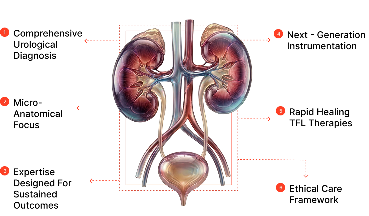 In the Department of Urology at Anandam Hospitals, we provide comprehensive evaluation and treatment for diseases related to the urinary tract and reproductive system. Our dedicated team is committed to delivering ethical, advanced, safe, and personalized patient-centric care, utilizing modern diagnostic modalities and minimally invasive surgical techniques. We expertly manage a vast spectrum of urological conditions affecting the kidneys, ureters, urinary bladder, prostate, urethra, and male genital organs. The department prioritizes accurate diagnoses, highly effective treatments, and diligent long-term follow-up to ensure optimal patient outcomes.